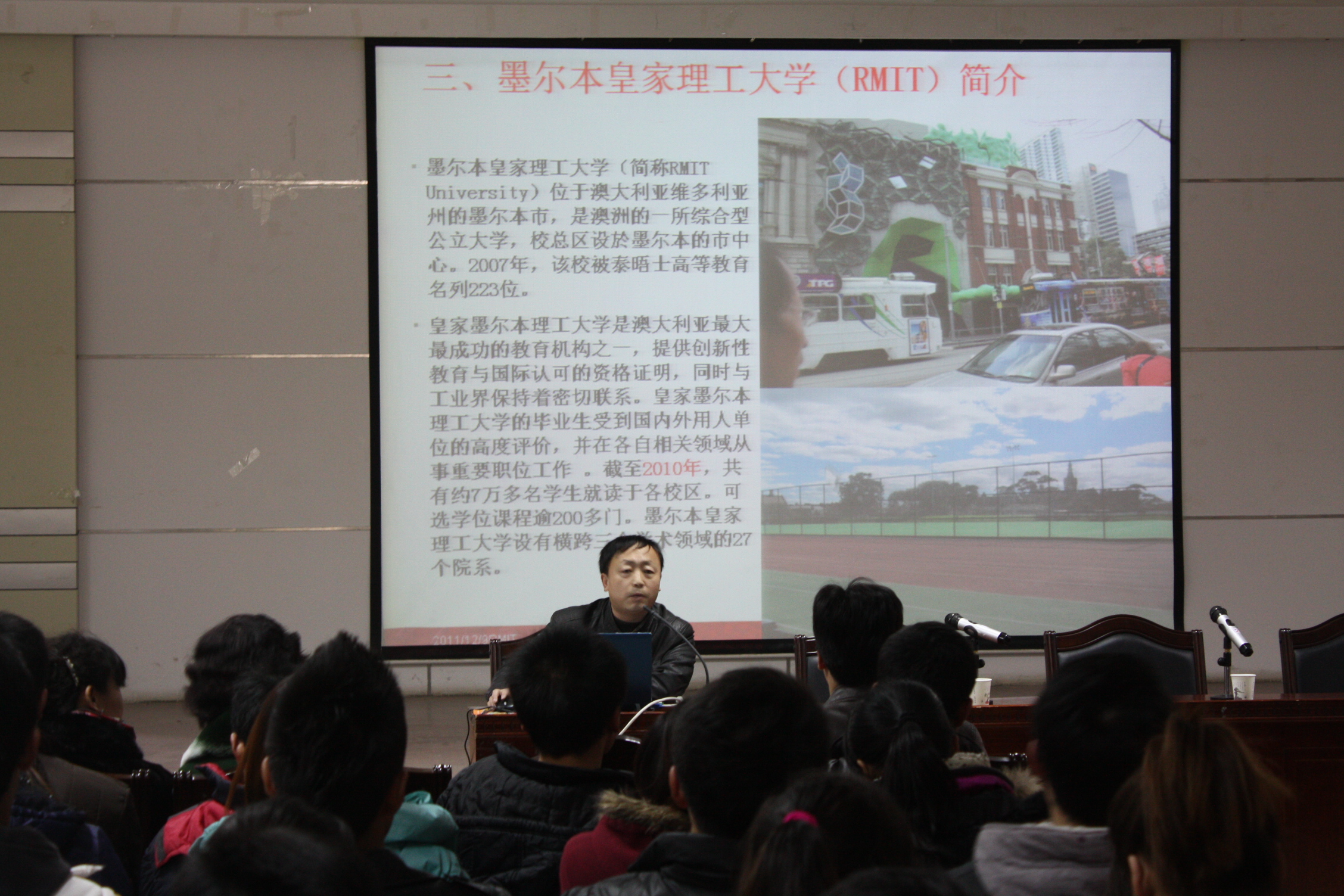 报告会上,龚云教授从墨尔本城市和风土人情,墨尔本皇家理工大学(RMIT)简介,自己所研究的课题以及在澳大利亚学习的收获和体会作报告。龚老师生动幽默的讲述了自己在澳大利亚的所见所闻,结合自己的经历分析了中澳教育体制的差异,强调现代教学要从实践出发,理论结合实践。
