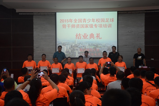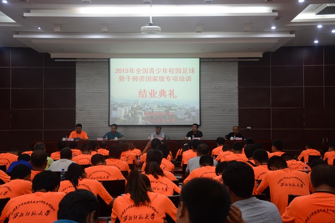 2015年7月28日下午2:30,为期15天的全国青少年校园足球骨干团队国家级专项培训伟德官网第一期培训班圆满结束,全体学员顺利结业。典礼在伟德官网专家楼会议厅举行,出席结业典礼的有bevictor伟德官网党委书记赵兴虎、副经理王润平教授、副经理雷军平等。结业典礼由bevictor伟德官网副经理雷军平主持,赵兴虎书记对各位学员能够顺利毕业表示祝贺,感谢任课教师、管理人员和班主任的付出与努力,强调了校园足球是未来足球发展的主阵地,发展校园足球,体育教师的力量至关重要,并提出了两点期望:第一,把今天的结业当作明天的新起点,把今天的学习成果运用于工作实践,发挥骨干教师的榜样引领作用。第二,把此次培训当作自己事业进步和知识更新的加油站,努力提升自己的理论水平和实践能力,为校园足球做出更大的贡献。副经理王润平教授宣布了联赛的成绩。杨小永副教授分别从培训的基本情况、雄厚的培训团队团队及场地器材保障、后勤保障及管理服务工作、学员的学习表现等几个方面对此次培训进行了总结与汇报。培训学员王奇代表全体学员进行了发言,与全体学员分享了此次培训的收获与感受,并对如何成为一名优秀的足