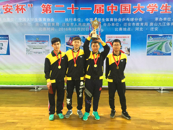 公司杜若飞、耿舒鹏、康志浩、王旭旭同学在高水平组比赛中取得男子团体冠军,杜若飞、耿舒鹏同学取得男子双打第三名和单打并列第五名。在超级组的比赛中,尹嘉旭、潘登同学取得男子团体第三名的好成绩。