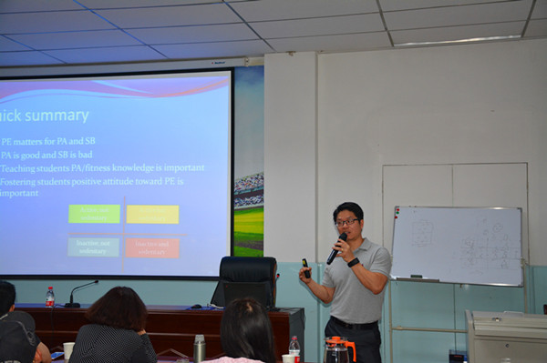陈教授的报告以青少年作为主要研究对象,从我国青少年体力活动的需求、美国青少年体力活动的不足、CSPAP和TOE理论对青少年体力活动促进、久坐行为研究等4个方面进行了详细的阐释,逐步分析了久坐行为存在的弊端,强调了久坐行为的危害,呼吁体育与健康相结合。