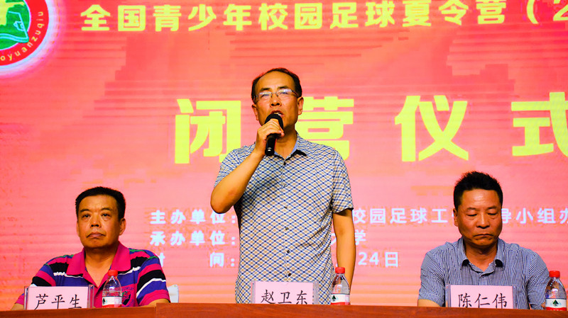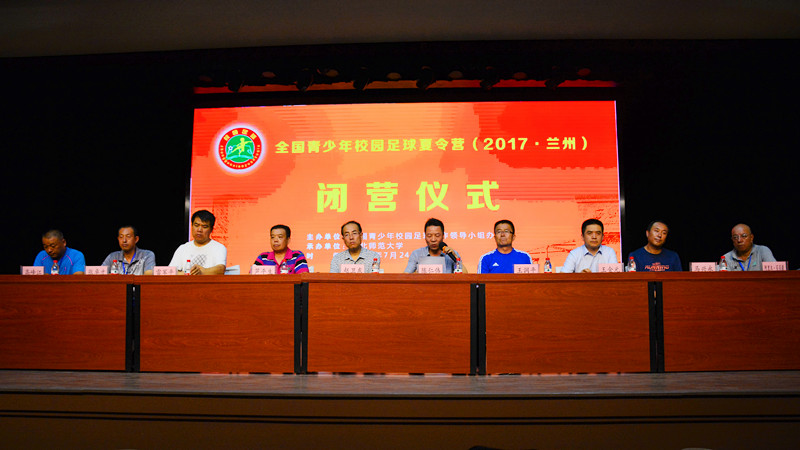 闭营仪式在各省区代表队营员们精彩绝伦的文艺表演后正式开始。营员代表姜婷婷和教练员代表夏依马尔当江.吾麦尔发言,教育部专家组代表王润平教授对专家组工作进行汇报,王金元同志宣读入选全国校园足球夏令营总营营员名单,芦平生副经理宣读优秀教练员名单。陈仁伟经理对活动做了“四大特色”总结并致闭营辞,赵卫东书记宣布2017年全国青少年校园足球夏令营初中组第四营区闭营。