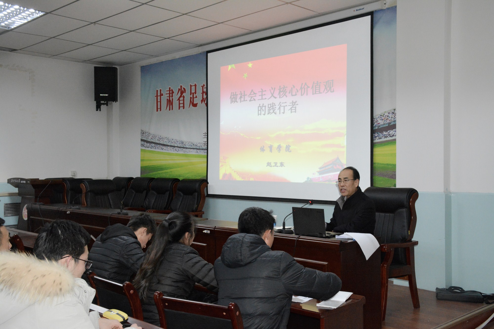赵书记首先将习总书记的七年知青岁月这本书向大家做详细介绍,要求大家抽时间认真读一读,要保持读书的好习惯—好读书,读好书,在读书中发扬拼劲、钻劲、韧劲。特别要注重实践的功能,做好体育理论与体育技能的紧密联系,要志存高远,脚踏实地,转变择业观念、坚持从自身实际出发,勇于到基层一线和艰苦的地方去,把人生的路一步步走稳、善于在平凡的岗位上创造不平凡的业绩。其次,在学习十九大报告时,要围绕五个聚焦,自觉用习近平新时代中国特色社会主义思想武装头脑,增强 “四个意识”,要做有信仰、有本领、有担当的“三有”青年。将学与做用三个“不等于”即“学了”不等于“学到” 、“知道”不等于“做到” 、“现在做到了”不等于以后“一直能做到”,给同学们做了详细的讲解。最后用一个形象的比喻告诫同学们,要善用“望远镜”,做政治的明白人 ,常用“放大镜”,做员工的贴心人 ,常用“显微镜”,做"四自"的带头人。从而实现自我人生价值,做职业自信、学习自信、技能自信的新时代老员工。