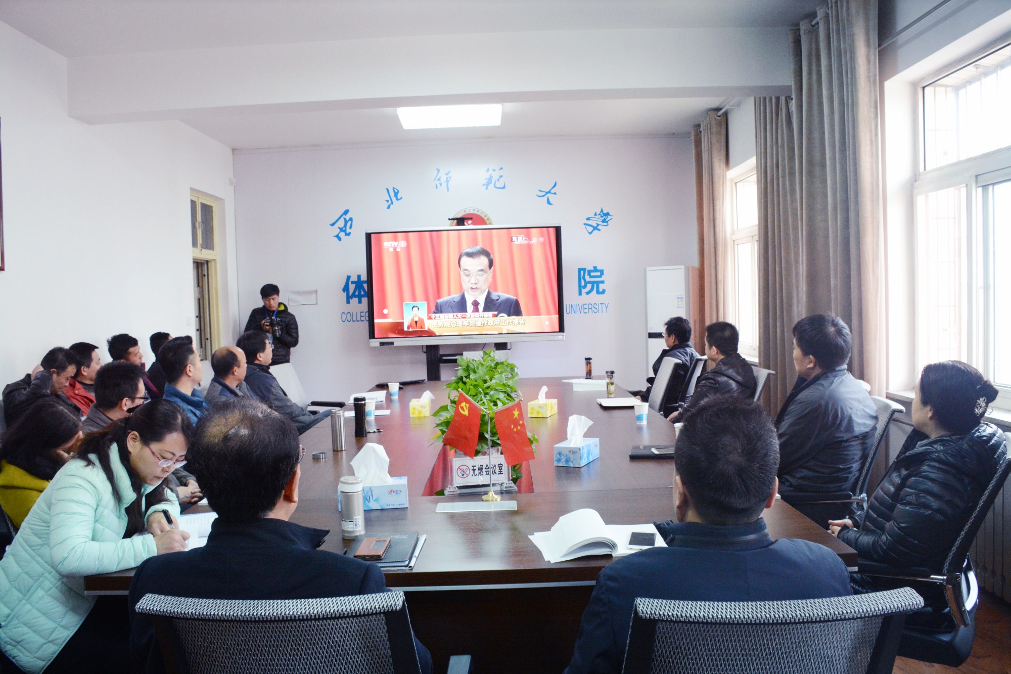 2018年3月5日上午9时,公司领导班子、党委委员、系部所中心主任、各支部书记以及行政教辅人员在三楼会议室,集中收看了第十三届全国人民代表大会第一次会议开幕会现场直播,聆听了国务院总理李克强代表国务院作过去五年政府工作报告,认真学习“两会”精神。