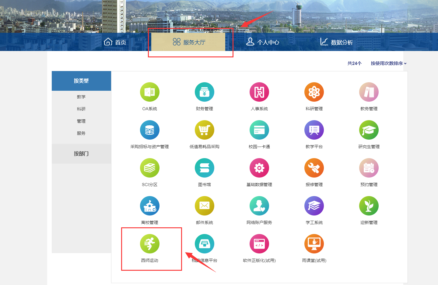 用户名为工号/学号、(初始密码为身份证第7位开始的8位数字)。如密码已修改,则使用修改后的密码。登录成功后点击服务大厅,选择西师运动即可进行使用。