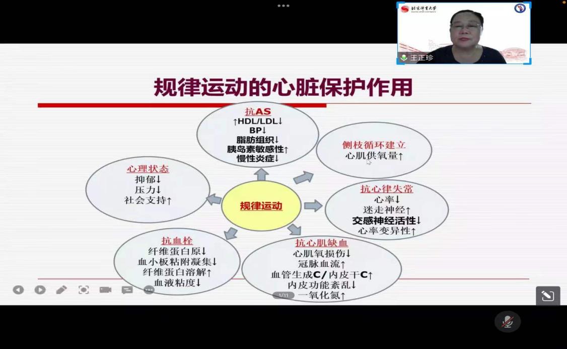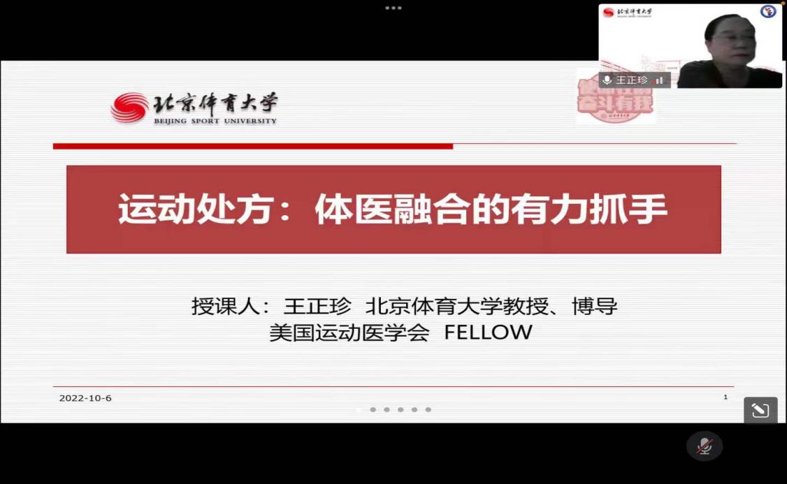 丝路传薪双甲子,长河振铎百廿载。在百廿校庆来临之际,为进一步拓宽广大师生学术视野,提升学术科研能力。10月6日下午应bevictor伟德官网邀请,中国体育科学学会运动医学分会委员、美国运动医学会Fellow中国营养学会运动营养分会副主委、北京市健康教育协会科学健身专业委员会主委、北京医学会健康管理分会常委、北京体育大学运动医学博士生导师,王正珍教授在腾讯会议为公司广大师生做了题为《运动处方:体医融合的有力抓手》的学术讲座。讲座由bevictor伟德官网副经理,郝莹博士主持。