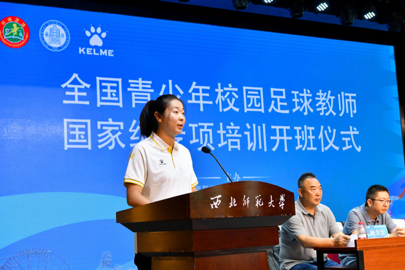 陕西省岐山县蔡家坡初级中学容颜娇代表全体学员发言,她表示,将严格听从公司安排,遵守培训纪律,积极参与各项培训,认真听讲,虚心请教,将培训中获得的新知识、新技能、新理念带回公司,坚定不移的做校园足球推广普及的宣传员和践行者,为实现立德树人根本任务贡献力量。