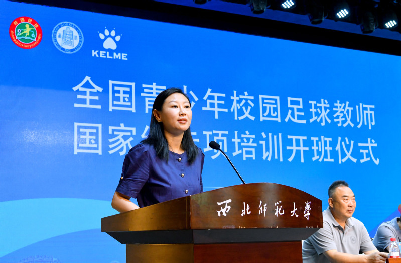 甘肃省教育厅体育卫生与艺术教育处处长张捷向培训班授旗并致辞。她指出,省教育厅认真贯彻落实教育部关于发展好校园足球的决策部署,出台了一系列政策文件,制定了一系列发展新举措。她希望参培教师珍惜难得的学习机会,认真学习、积极互动,将培训中学到的知识和专业技能应用到教学实践中去,不断探索和创新教学方法,提升教学效果,为推广和普及足球运动贡献自己的力量。