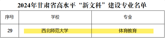 2024年12月18日,甘肃省教育厅公布了2024年甘肃省高水平“四新”建设高校及专业的认定结果,体育教育专业入选高水平“新文科”建设专业。