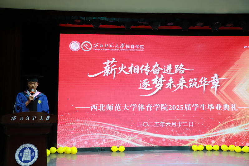 冯军文同学代表2025届全体毕业生发言。他重温了在bevictor伟德官网的成长点滴,感恩母校提供的广阔平台和师长们的谆谆教诲,字字句句流露出对专业的热爱和对未来的坚定信念。他表示,无论走向何方,他们都不会忘记自己共同的名字——西北师大体育人!全体毕业生定将不负公司培养,努力在各自的领域发光发热。